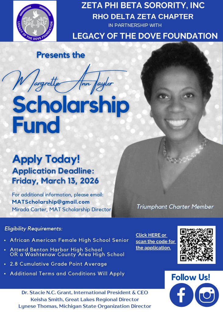 The MAT Scholarship Fund, administered by the Legacy of the Dove Foundation, commemorates the legacy of Triumphant Soror Margrette Ann Taylor, a distinguished member of Zeta Phi Beta Sorority Inc., Rho Delta Zeta Chapter. Soror Taylor, a National Labor Relations Attorney for the federal government, passed away on September 6, 2000.